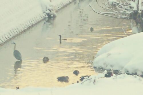 シラサギ(ダイサギ)とアオサギの新たなドラマ誕生 小さな川の水鳥たち シラサギ アオサギ カワウ コガモ・あとがき 今回はおもに2日に撮影した画像を紹介するが、そこには意外なドラマがあった。是非、のんびりと眺めていただきたい。